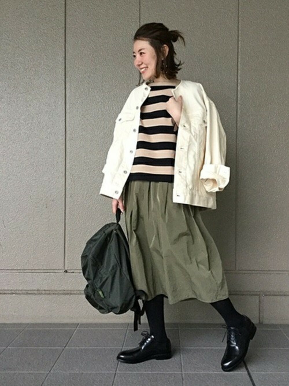 Mのノーカラージャケット「ピースダイツイル ノーカラーGジャン#」を使ったコーディネート