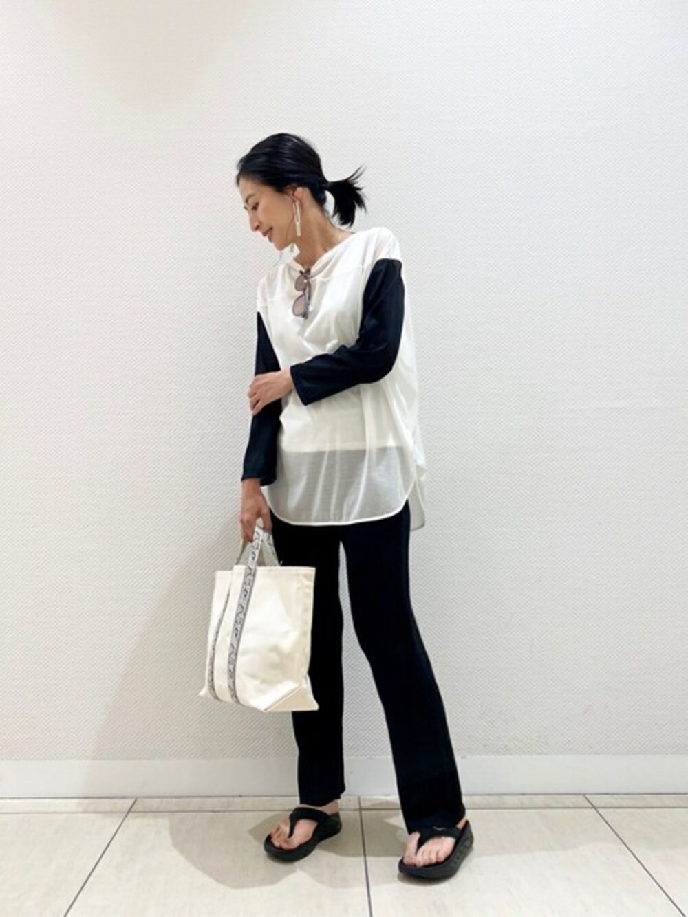 【NEU】シャイニーベースボールTシャツ デザインはカジュアルですが、透け感のある素材でキレイ目な印象でも着て頂けます。 お尻周りが隠れる着丈なのでトレンドのリブパンツでの合わせもおススメです。 サイズ感:肩周りがたっぷりしたつくりでゆったりしています。 素材感:さらっとしており、涼しく清涼感があります。 着心地:透け感と軽い着心地が特徴です。ボトムにインもしやすく着まわし易いカットソーです。
