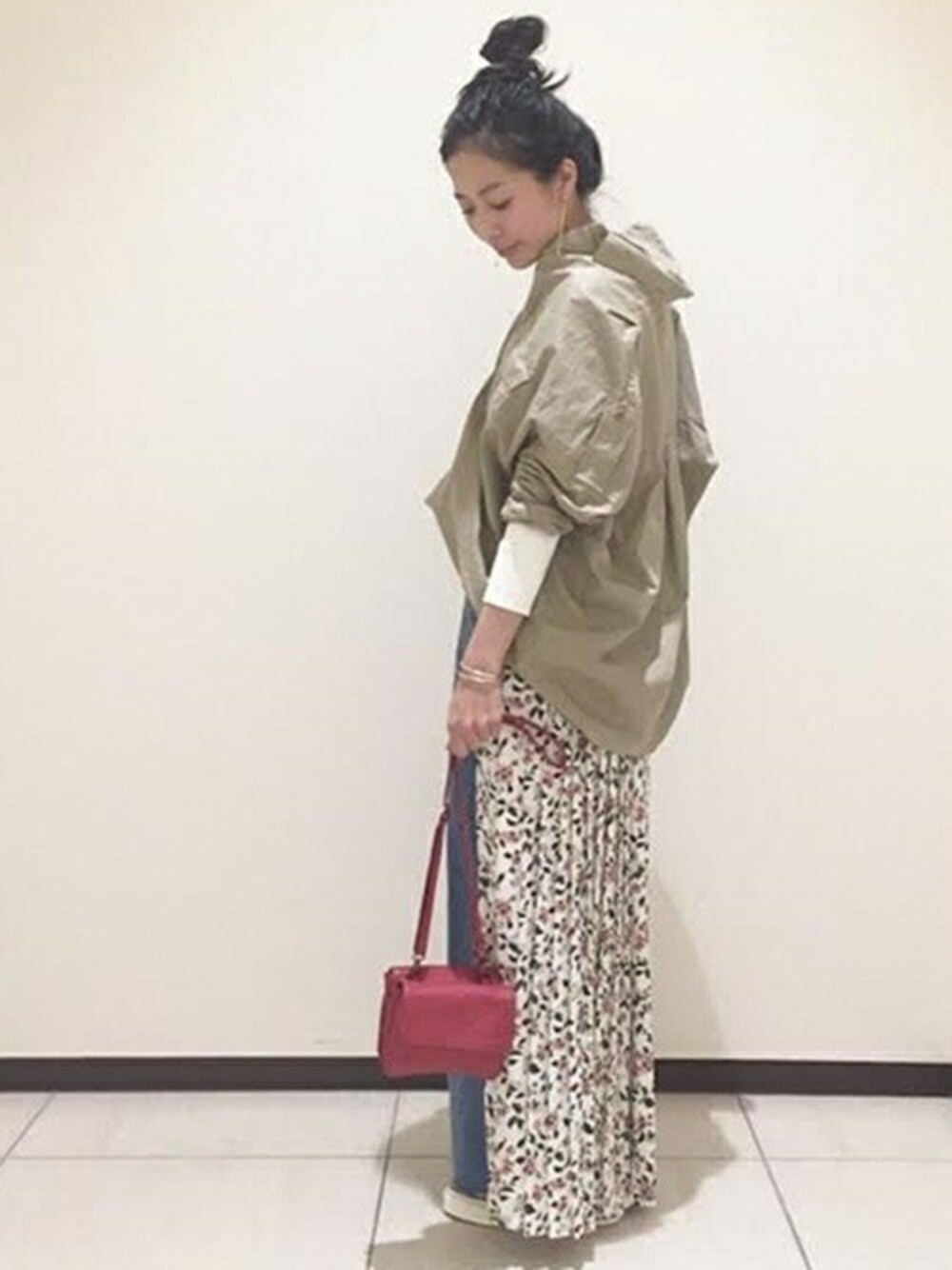 メンズライクなミリタリーシャツも、落ち感のある素材の花柄パンツと合わせて、女性らしさをプラス。