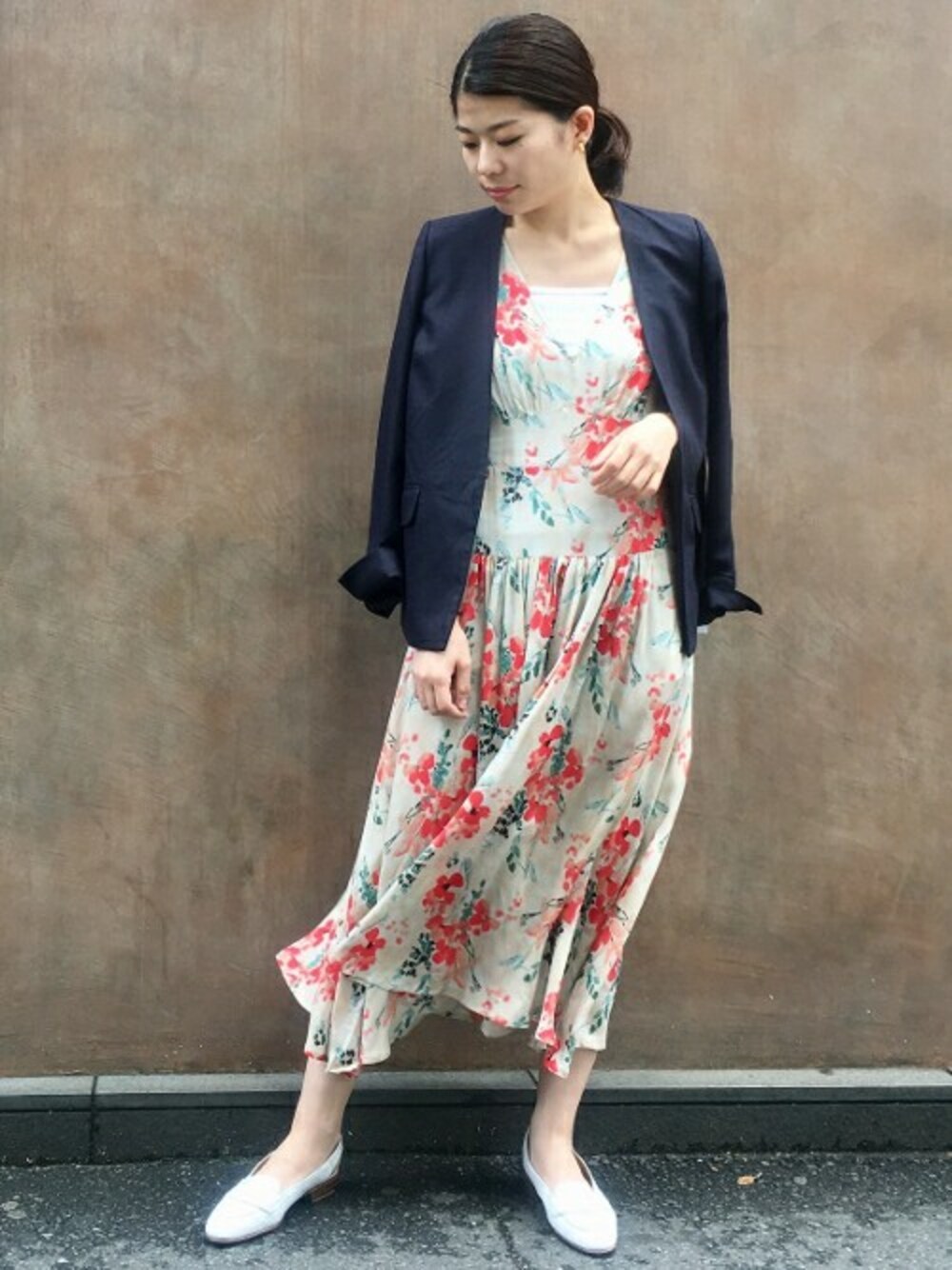 ノーカラースラブジャケット。肌寒い日はワンピースの上からサラッと肩掛けスタイルを。