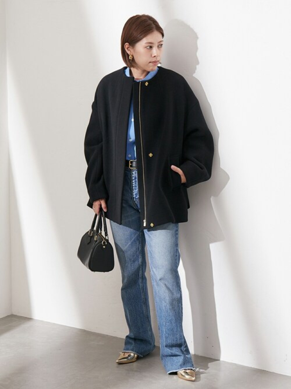 journal standard L'essage 銀座店スタッフのノーカラーコート「SUPER140S/MARINI クルーネックショートコート」を使ったコーディネート
