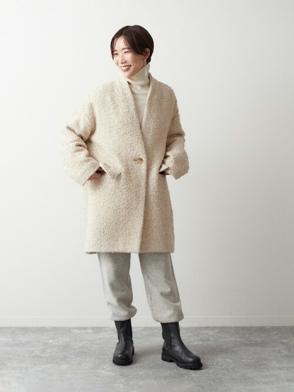 yasumotoのノーカラーコート「コクーンミドルコート2」を使ったコーディネート