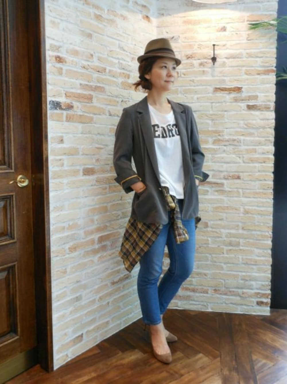 秋のマニッシュスタイルに、崩しアイテムとしてチェックシャツをプラス。