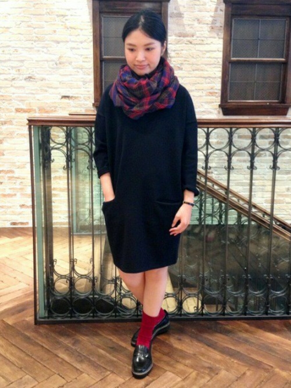 シンプルなワンピースにチェックのストールをポイントに合わせたスタイリング。 ワンピースの素材はウールなので、冬もタイツ等と合わせて暖かく着て頂けます。 チェックのストールと今年大人気のローファーを合わせてトラッドな着こなしに。