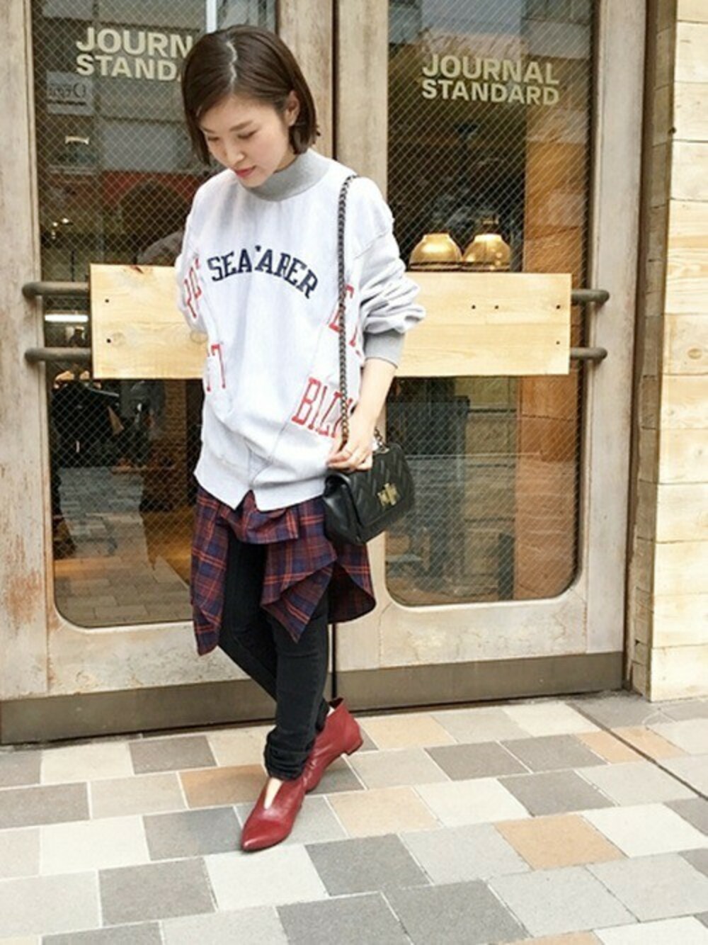 一点ずつ異なる絵柄でインパクトがあるシルエットの77CIRCAのリメイクスウェットメインに黒のスキニーで合わせました。