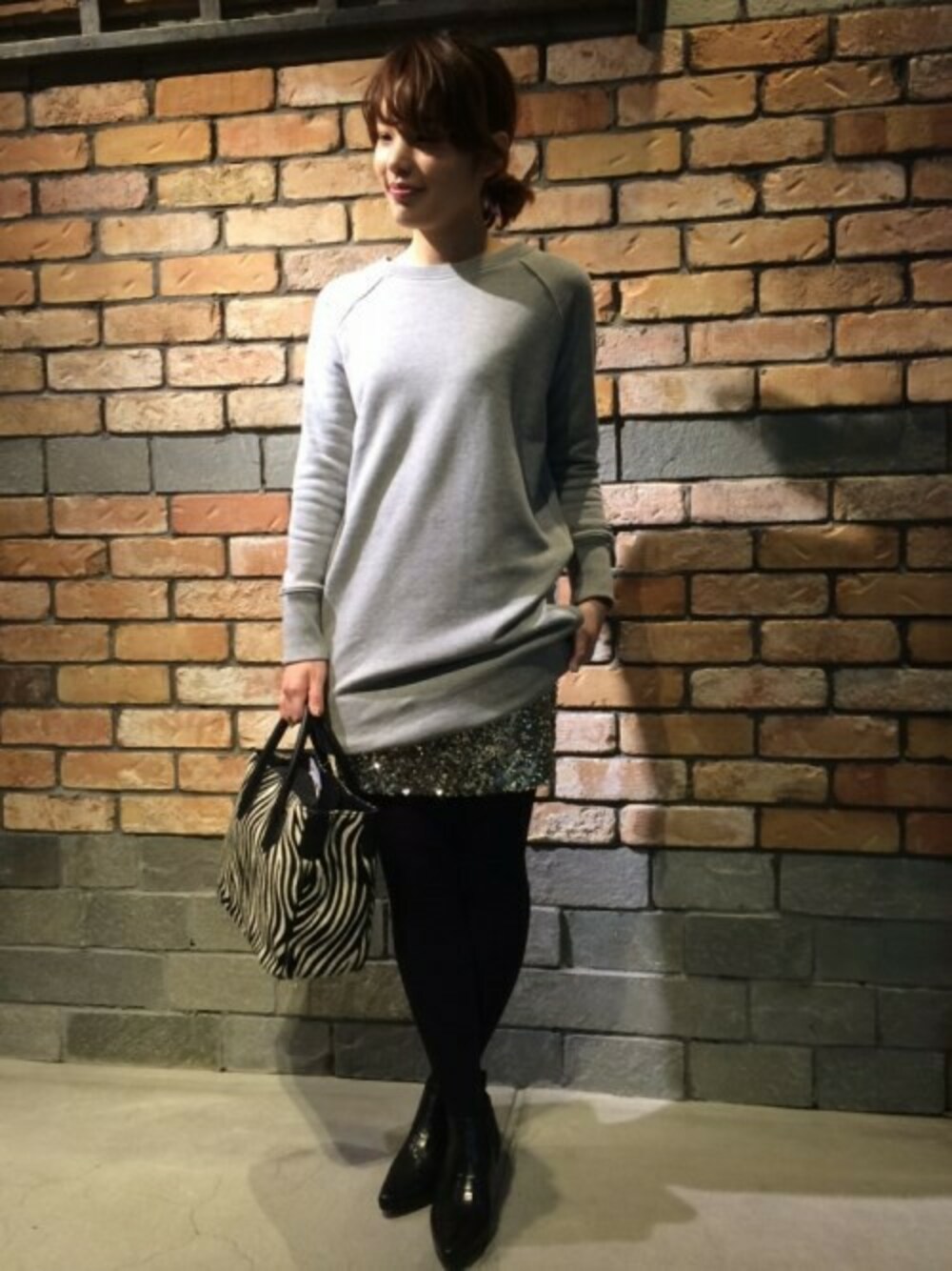 春先まで長く着れるチュニック丈のスエットは、一枚あると便利なアイテム!裾からスパンコールのスカートをちらっと見せてポイントに◎