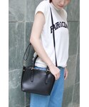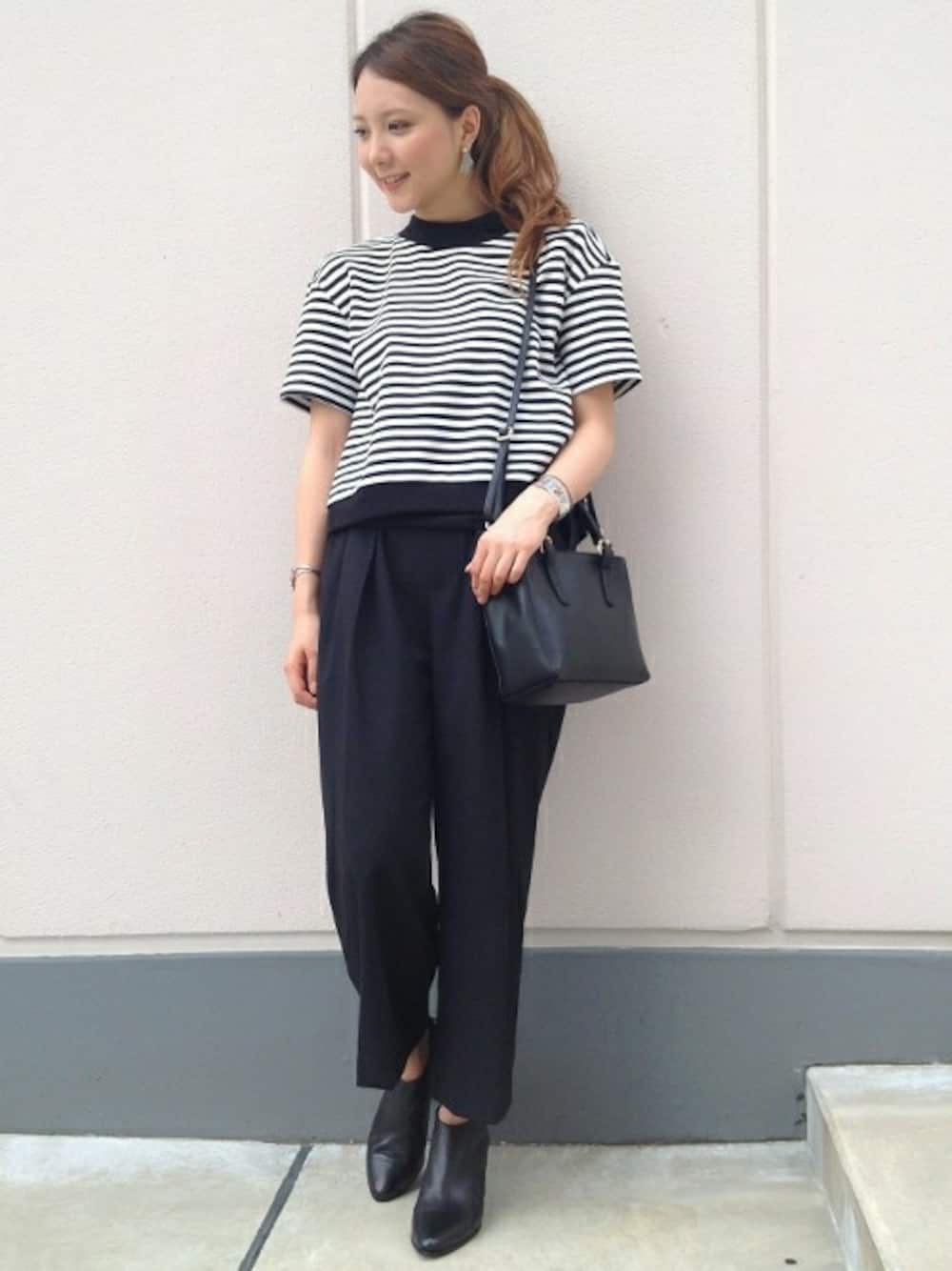 ボーダートップスとワイドパンツでモノトーンスタイルに仕上げました。 小物もブラックで統一することで、すっきりまとまります◎
