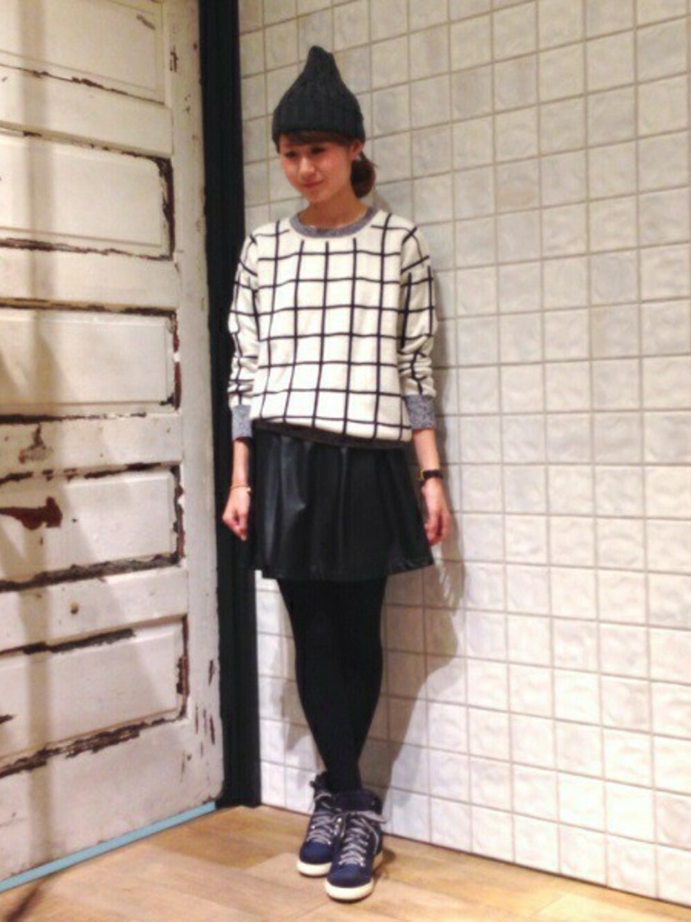 チェックニットにフェイクレザーのスカートを合わせて女性らしい組み合わせに スニーカーとニットキャップのメンズライクなアイテムでスポーティーMIXなコーディネート。 チェックニットは今年注目のアイテムです!!