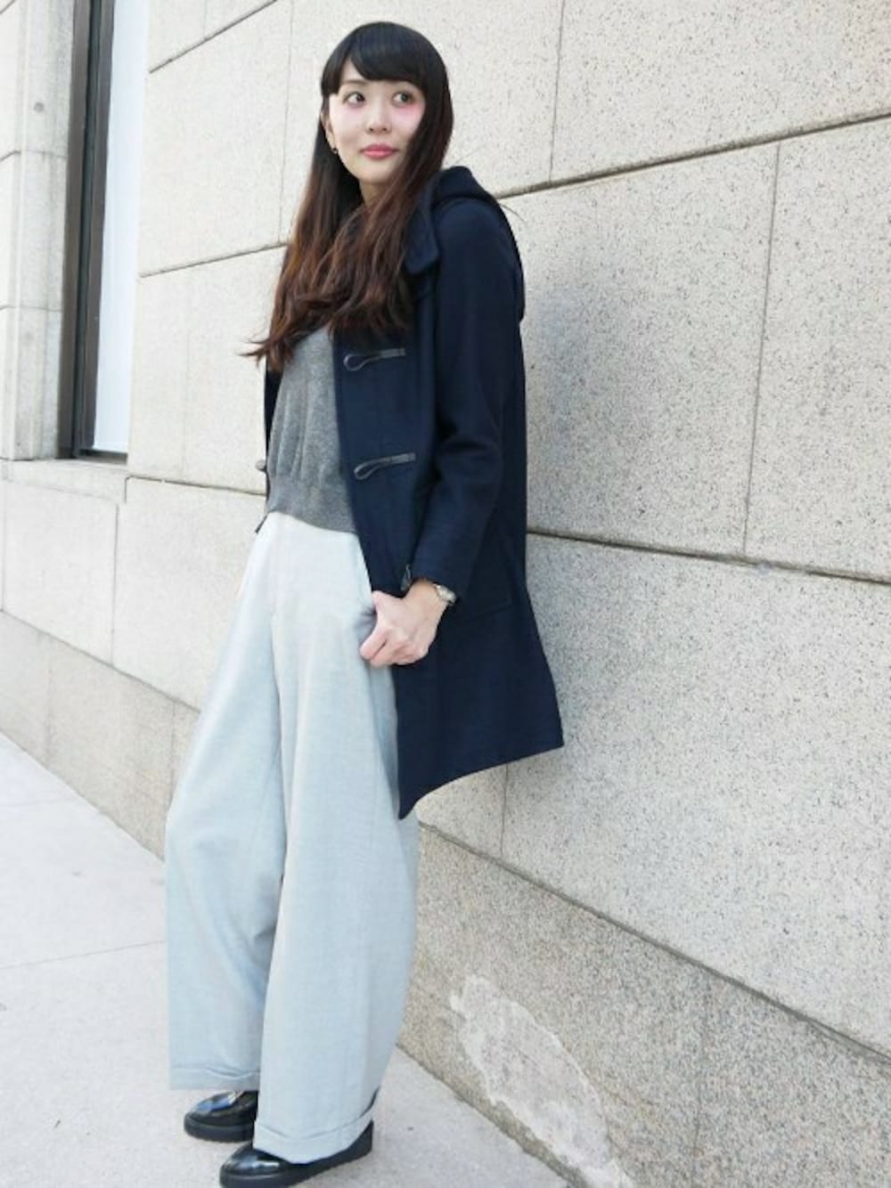 グレーでまとまたTONEonTONEのスタイルにロングダッフルで引き締めて。 シックなカラーで大人っぽくまとまります◎