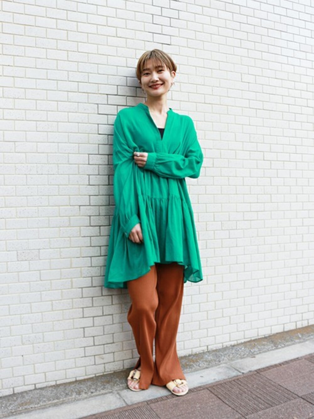 肌触りが優しいコットン素材を使用したティアードチュニック。 ギャザーをふんだんに施した、ふんわりとボリュームのあるフォルムが魅力 鮮やかなグリーンが目を引くチュニックブラウス。