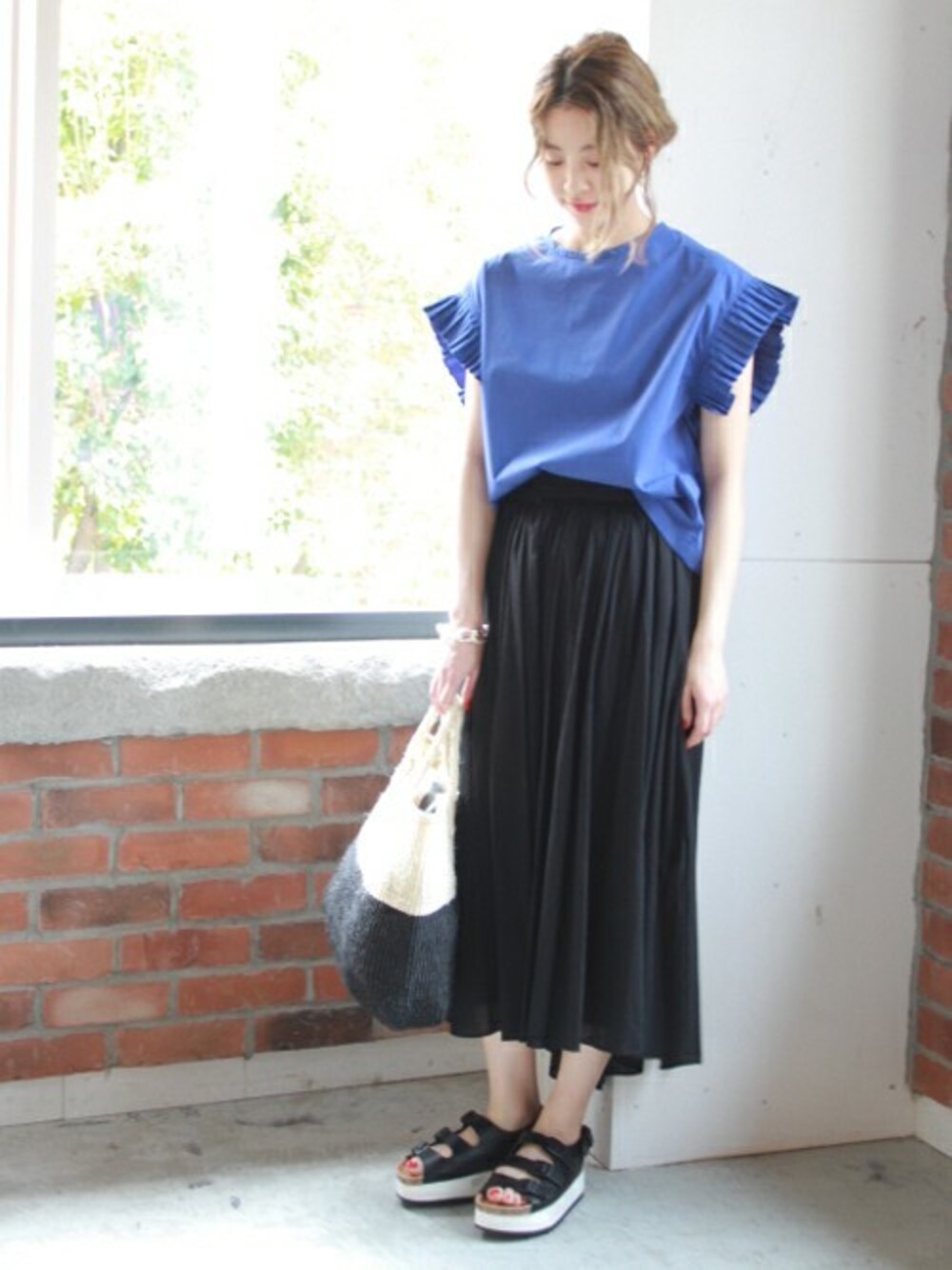 ◆新鮮なブルーが主役 ブルー×ブラックの配色も、薄手のアイテムなら夏らしい爽やかな印象に。 今年はカラーアイテムを投入して新鮮なスタイリングに挑戦!