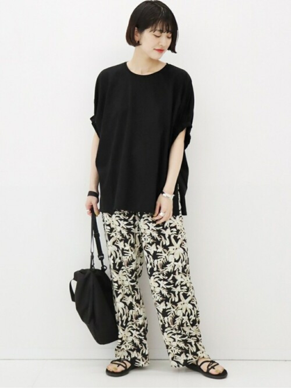 《WEB限定予約》クールローレルギャザースリーブTシャツ◆ 袖口のゴムスリーブがポイントのデザインTシャツ。 プリントパンツに合わせてモノトーンのコーディネートです。 Drifterのバッグと合わせ抜け感のあるスタイルに! サイズ感:身体のラインが出にくいサイズ感です。 素材感:さらっとしていて落ち感がある素材です。 着心地:厚すぎない生地なので、カジュアルすぎず着て頂けます。 **********************
