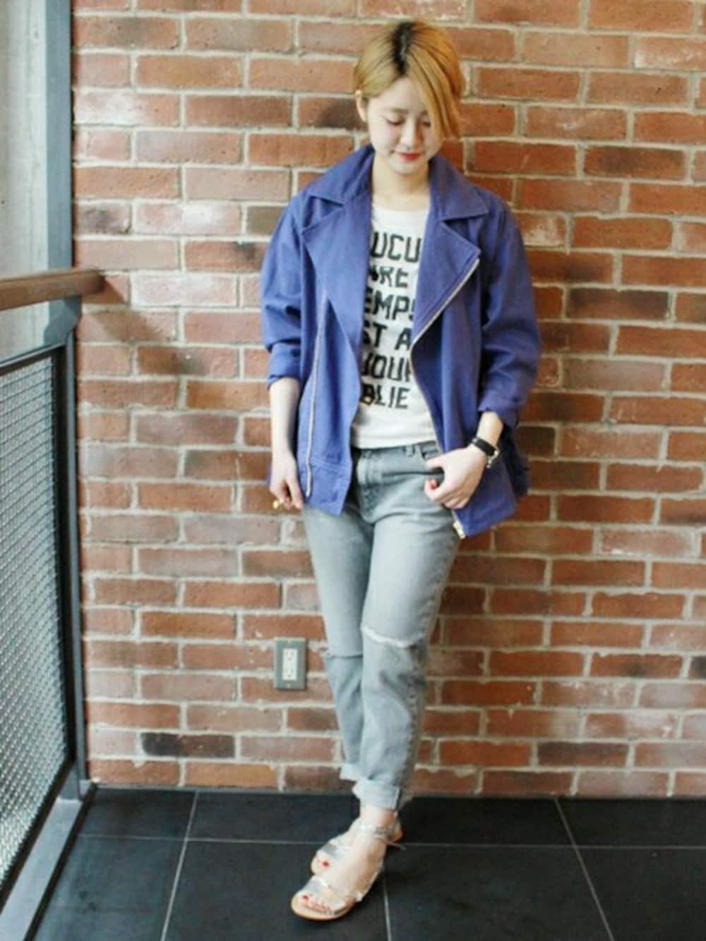 鮮やかな色味が目を惹く今年らしいオーバーサイズのライダースに、毎年人気のオリジナルロゴTシャツを合わせたスタイリング。ダメージデニムでメンズライクに着こなすのが今年の気分♪サンダルで女性らしさも忘れずに。