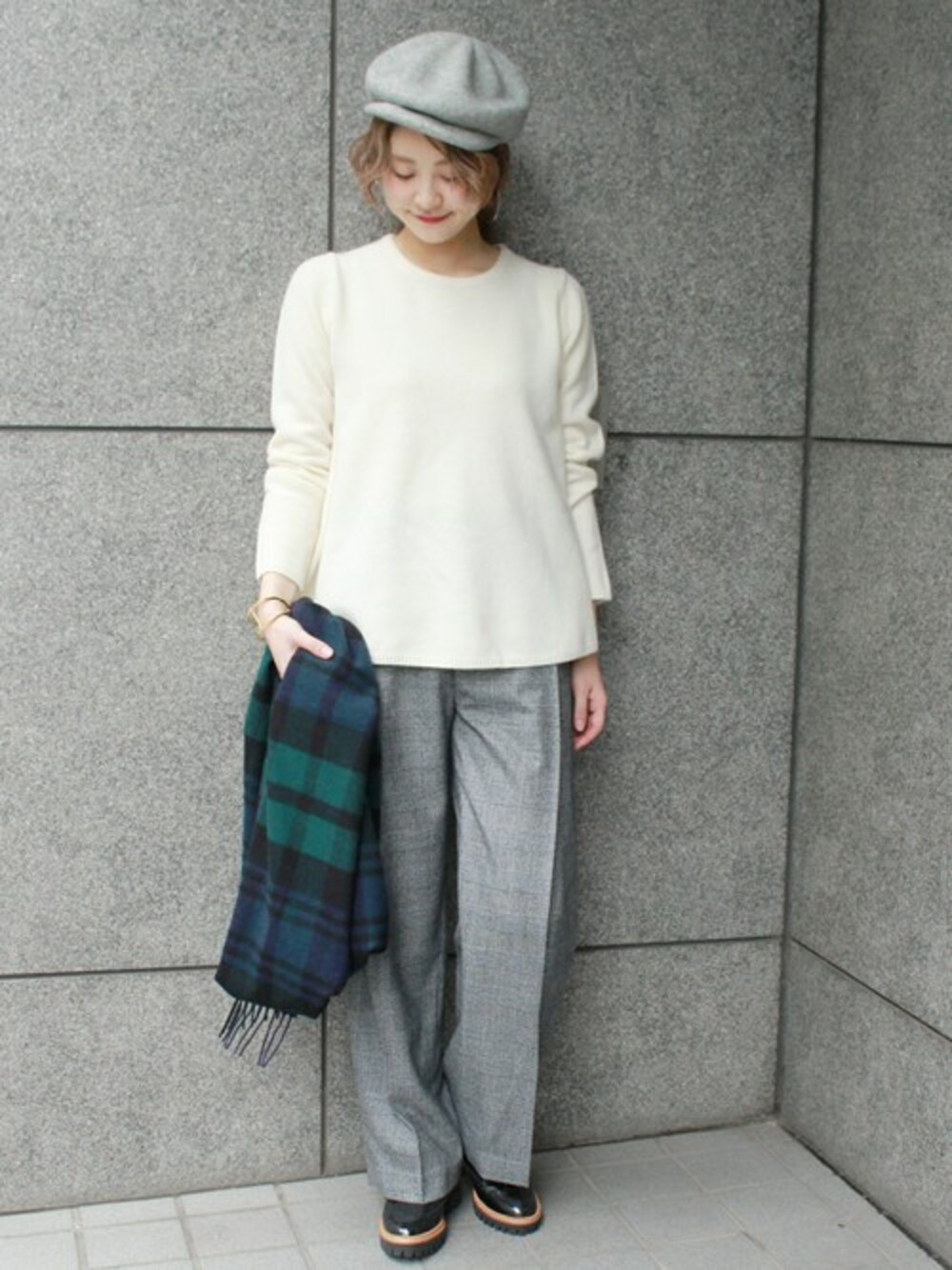 カシミヤ混フレアプルオーバー ふんわりとフレアに広がるシルエットが女性らしく、一枚でもサマになるデザイン。 カシミヤ混ならではの、柔らかく、ちくちくしない着心地の良さも魅力です。 グレンチェックのワイドパンツを合わせたトラッドなスタイリング。