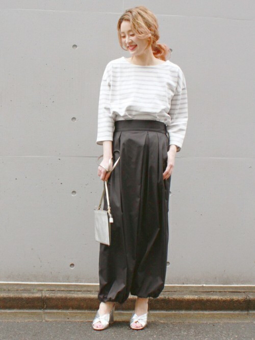 トレンドのボリュームのあるデザインのパンツをカジュアルに、きれいめに。 シンプルだからよく映えます。