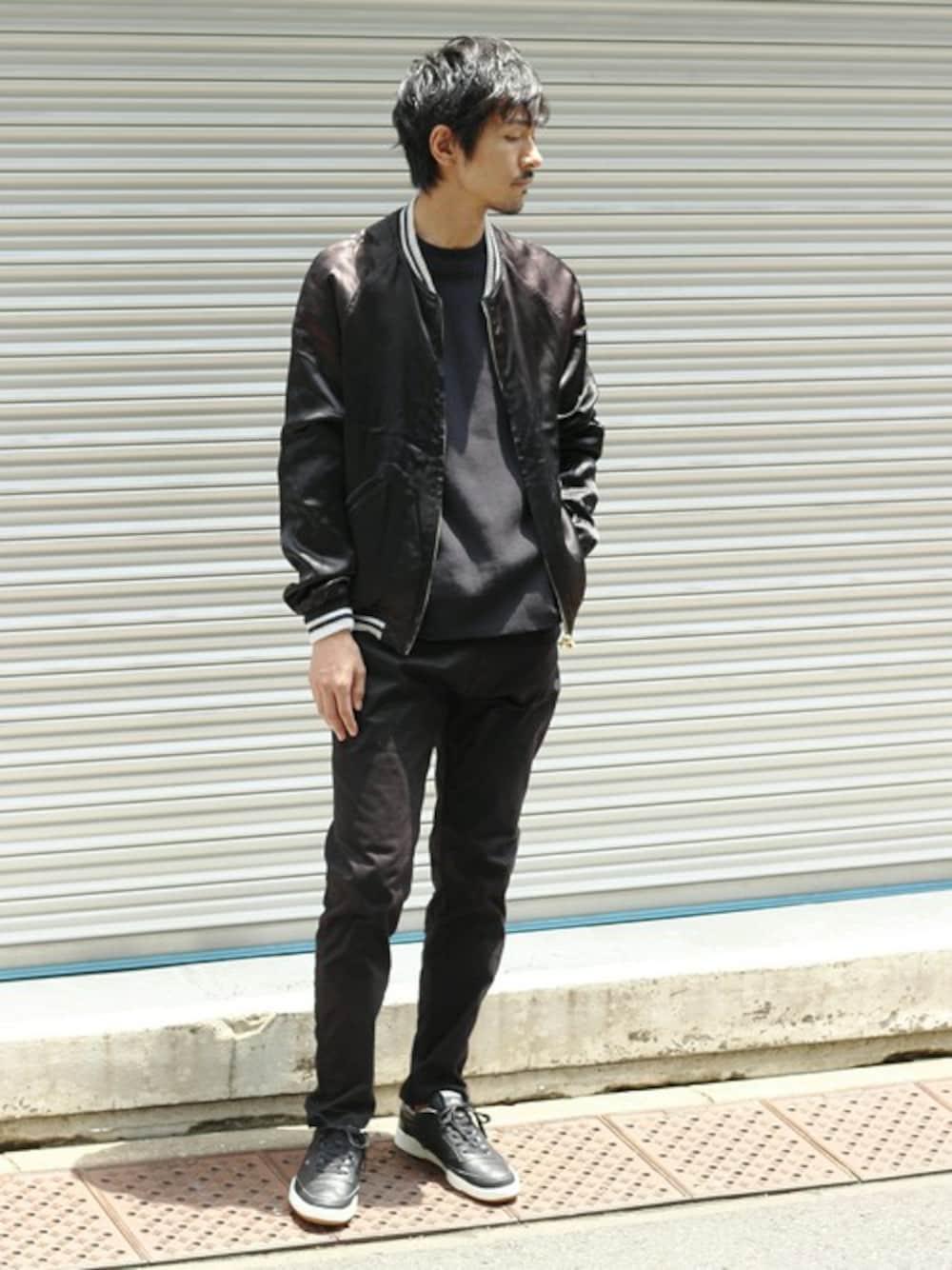 ワントーンでストリートカジュアルスタイル ブラックのワントーンで組み合わせてみました。 ストリート感が出るようにスカジャン、スニーカー,CAMPIONとカジュアルアイテムでコーディネート。