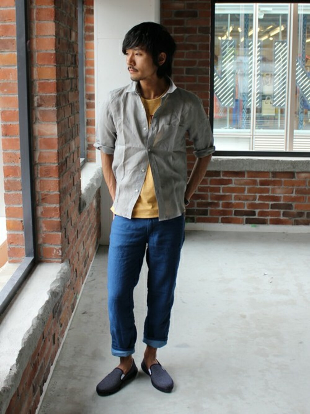 全体的に落ち着いた色味のトップスとパンツに黄色のプリントTを合わせ、遊びごころを取り入れた夏スタイリング。