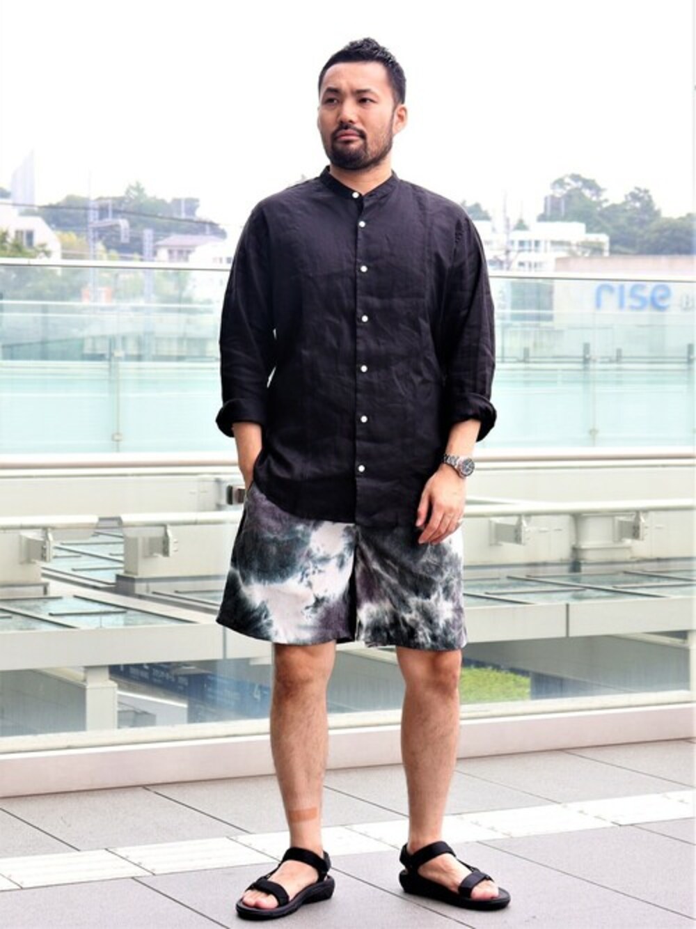 【 STYLE SAMPLE 二子玉川 】 年齢 31歳 伸長 173cm 体重 65kg リネンバンドシャツ 普段サイズ M 着用サイズ L サイズ感 ややゆとりのあるゆったりシルエット 素材感 肌触り良く、風通しの良いリネン素材 コメント 大人のブラックカラーで、ワンラク上のオシャレを カットソー 普段サイズ M 着用サイズ L サイズ感 身幅にゆとりがあり、着丈はスッキリ 素材感 伸縮のある織りで、しっとりとした肌触りが優しい コメント さりげない胸のプリント使いで、インナーでも一枚着としても着用可能 ショーツ 普段サイズ L 着用サイズ L サイズ感 膝丈上のコンパクトなシルエット 素材感 軽さのあるポリエステル コメント 夏のシンプルなコーデにハマるタイダイショーツ サンダル 普段サイズ 27cm 着用サイズ US090