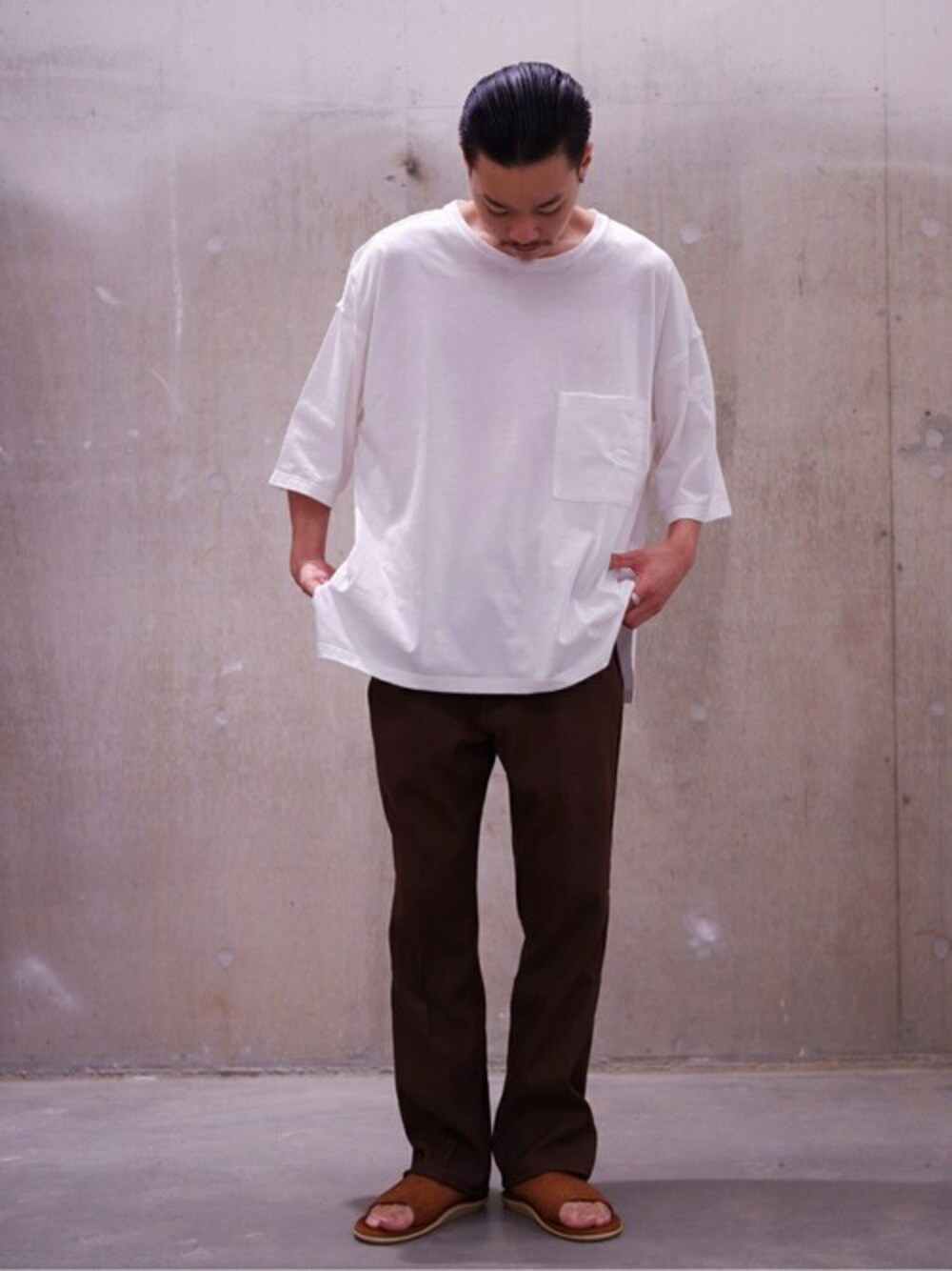 Tshirt 着用感:ゆったり 素材感:柔らかい 着心地:身幅太め pants 着用感:細身 素材感:固め 着心地:ウエスト太め 一言コメント Are you happy?シリーズのcut offは横にスリットが入っているので自然といい意味での緩さが出ます。