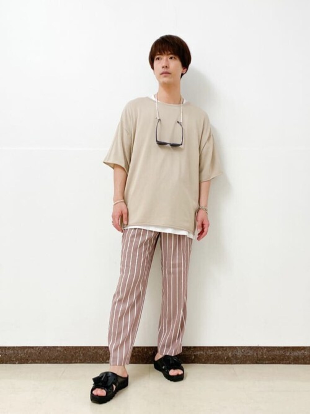 体型:標準 身長:175cm 体重:63Kg 普段サイズ:アウター-M インナー-M パンツ-M シューズ-27.0㎝ トップス:サイズ/ L 着用感/ ゆったり 素材感/ 麻のような清涼感のある素材 着心地/ ドライタッチで夏まで着用できる パンツ:サイズ/ M 着用感/ ややすっきり 素材感/ 柔らかく軽いコットン素材 着心地/ 程よいゆとりがあり涼しい着心地 一言コメント: トップスはタンクトップがセットになっており、ラフに着こなすだけでも流行りのレイヤードスタイルになるアイテムです。 ワンポイントとしてストライプ柄のパンツを合わせることで、さらにオシャレ感を演出しコーディネートにもメリハリが出るようにしています。