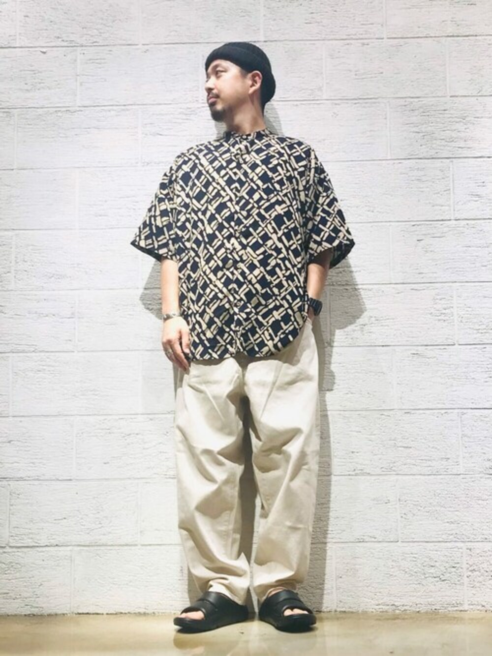 ジャーナルスタンダード メンズ(JOURNAL STANDARD 本社)のシャツ/ブラウス「【シャツ+ショーツ+巾着袋の3点セット】ホームウェア SUMMER セットアップ/部屋着/ワンマイル/オーバーサイズ/バンドカラー半袖シャツ/バギーショーツ/[10色展開/総柄/ウォールペイント/無地][ユニセックス対応]」を使ったコーディネート