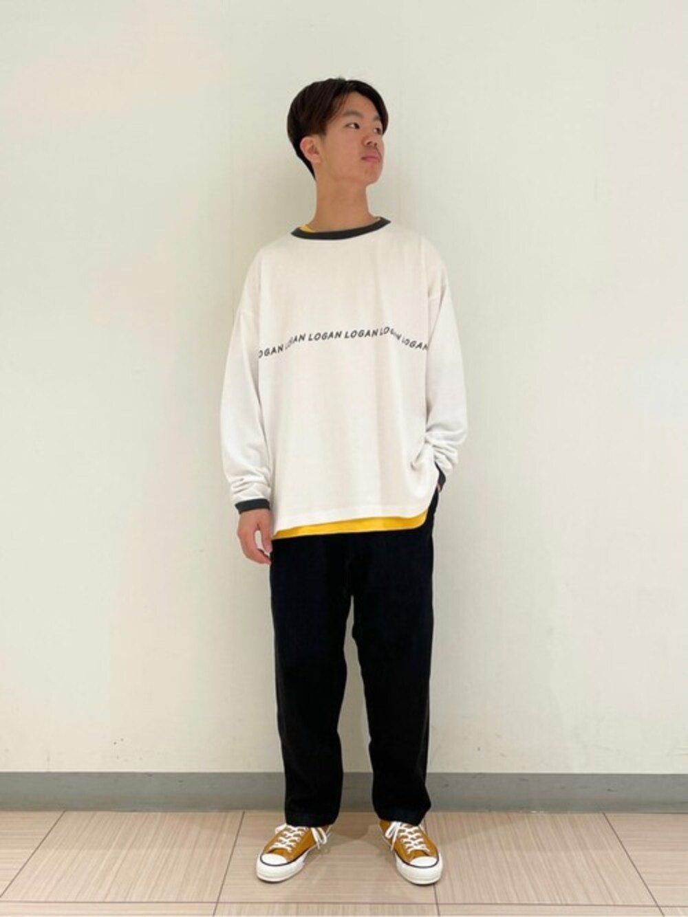 身長:174cm 体重:62Kg 普段サイズ:ブルゾン-M カットソー-M パンツ-M シューズ-27.5cm カットソー:サイズ/ M サイズ感/ 身幅が広めなシルエットでやや大きめなサイズ感 素材感/ 硬めな肌触りのコットン100% 着心地/ ゆったりと一枚でも着やすい パンツ:サイズ/ M サイズ感/ Mサイズでジャストサイズ 素材感/ コットン99%、ポリウレタン1% 着心地/ 伸縮性があり、動きやすく快適な着用感 一言コメント:LOGAN x JSのロンTにGRAMICCIのデニムをブラック色で合わせたブラック色メインなコーディネートです! インナーにイエロー色のTシャツとイエロー系のスニーカーで合わせてます!
