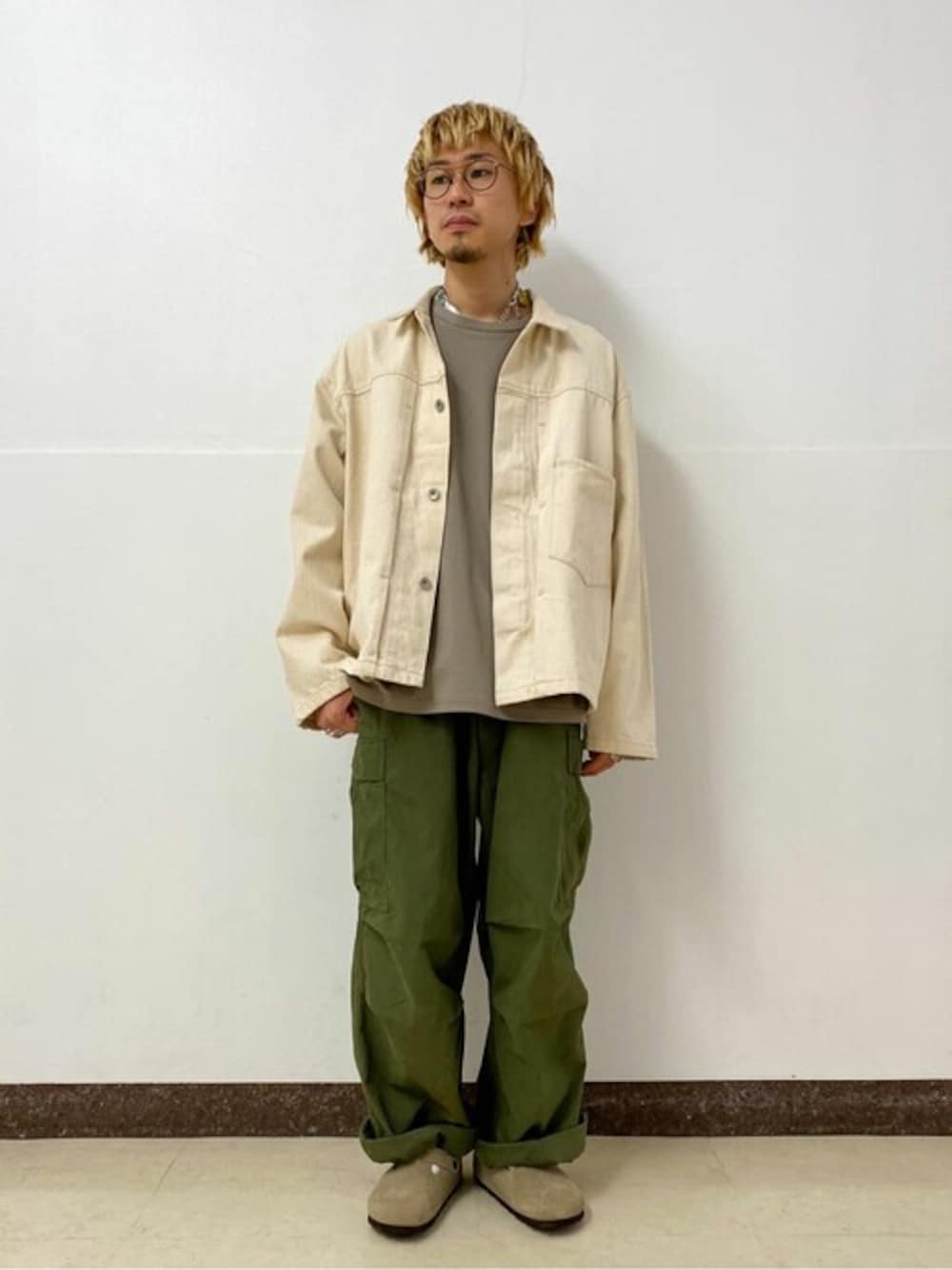 体型:小柄細身 身長:165cm 体重:50Kg 普段サイズ:アウター-S インナー-S パンツ-S シューズ-25.5㎝ アウター:サイズ/ M 着用感/ ルーズなボックスシルエット、Gジャンでも着丈が短すぎないので合わせやすい 素材感/ 柔らかいデニム素材 着心地/ ゆとりがあるので動きやすく快適、中に着込める インナー:サイズ/ M 着用感/ ルーズシルエット、着丈がすっきりしていて綺麗 素材感/ つるっとした綿素材 着心地/ 肌触りがよくごわつかない快適な着心地 パンツ:サイズ/ M 着用感/ ワイドストレートのカーゴパンツ、定番の形 素材感/ 柔らかい綿素材 着心地/ 膝にプリーツが入るので動きやすい、イージーパンツなので楽な履き心地 一言コメント: 白のデニムジャケットにArmyTwillのカーゴパンツを合わせた直球ですが少し通好みなアメカジコーデです。 白のデニムジャケットはインディゴほどコテコテになりすぎず綺麗目でも合わせやすいのでおすすめです。
