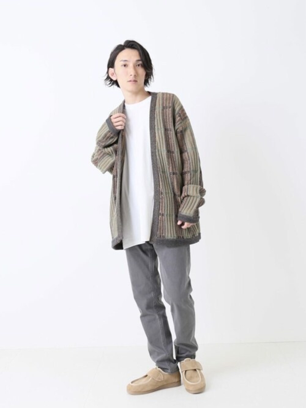 【GEOM PATTERN/ジャガード カーディガン】 身長:167cm 体重:50kg 普段サイズ: S 着用サイズ: L 着用感:オーバーサイズで着用 素材感:柔らかい伸縮性のある素材感 着心地:とても柔らかい素材感で肌触りが良く、程よくゆったりとしたサイズ感で楽な着心地です。 インナー 普段サイズ: S 着用サイズ: M 着用感:ゆったり パンツ 普段サイズ: S 着用サイズ: M 着用感:ゆったり シューズ 普段サイズ: 26〜26.5 着用サイズ: 80(26) 着用感:ジャスト