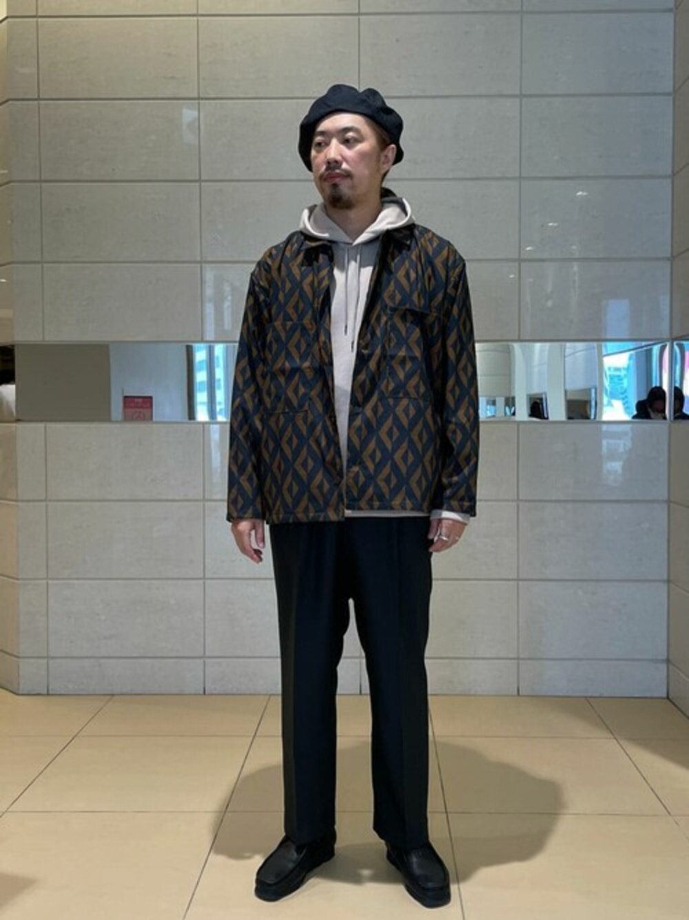 身長:178cm 体重:77kg 普段サイズ:L〜XL OUTER 着用サイズ : L 着用感 :身幅もありソフトな生地感なので軽くて着やすいです。インナーもTシャツからパーカーまでシーンに合わせて選ぶと雰囲気も変えれます! 素材感 : ポリエステル100% PANTS 着用サイズ : L 着用感 : 程よくワイドなシルエット。軽さと柔らかい生地ですが季節問わず着用できます! 素材 :ポリエステル100% PARKA 着用サイズ:L 着用感:少しビッグシルエットで光沢感があるのでカジュアル過ぎず大人な印象です。ストレッチ性と高く動きやすく重ね着もしやすいと思います。 素材:ポリエステル76% コットン24% SHOES 着用サイズ : 8(メーカーサイズ) 皮質も柔らかくソールのクッション性もあり履きやすく感じます。ゴアテックスを採用しており防水性はもちろわ透湿性あるので内側の蒸れを外へ逃してくれます! 一言コメント:定番のジオメシリーズの新作が入ってきました。シンプルなTシャツやパーカーなどで合わせることで柄のパターンも活かすコーディネートが組めます。ワイドなシルエットのパンツ、レザーシューズで合わせるスタイルはオススメです!