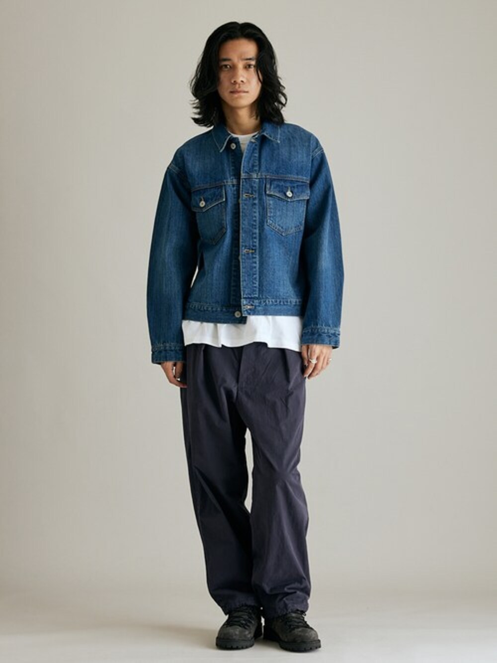 身長:181cm 体型:痩せ型 普段着用サイズ:L 程よい厚さの13ozデニムを使用したデニムトラッカージャケット。 肩が少し落ちていますが、着丈はスッキリとしているのでスタイルが良く見えておすすめ。 ワイドパンツでも細身のパンツでもボトムを選ばず着用できると思います。 《トラッカージャケット》 着用サイズ:L 着用サイズ感:身幅はゆったりとしていて着用しやすいです。 《オーバーパンツ》 着用サイズ:M 着用サイズ感:ゆったりと着用できました。