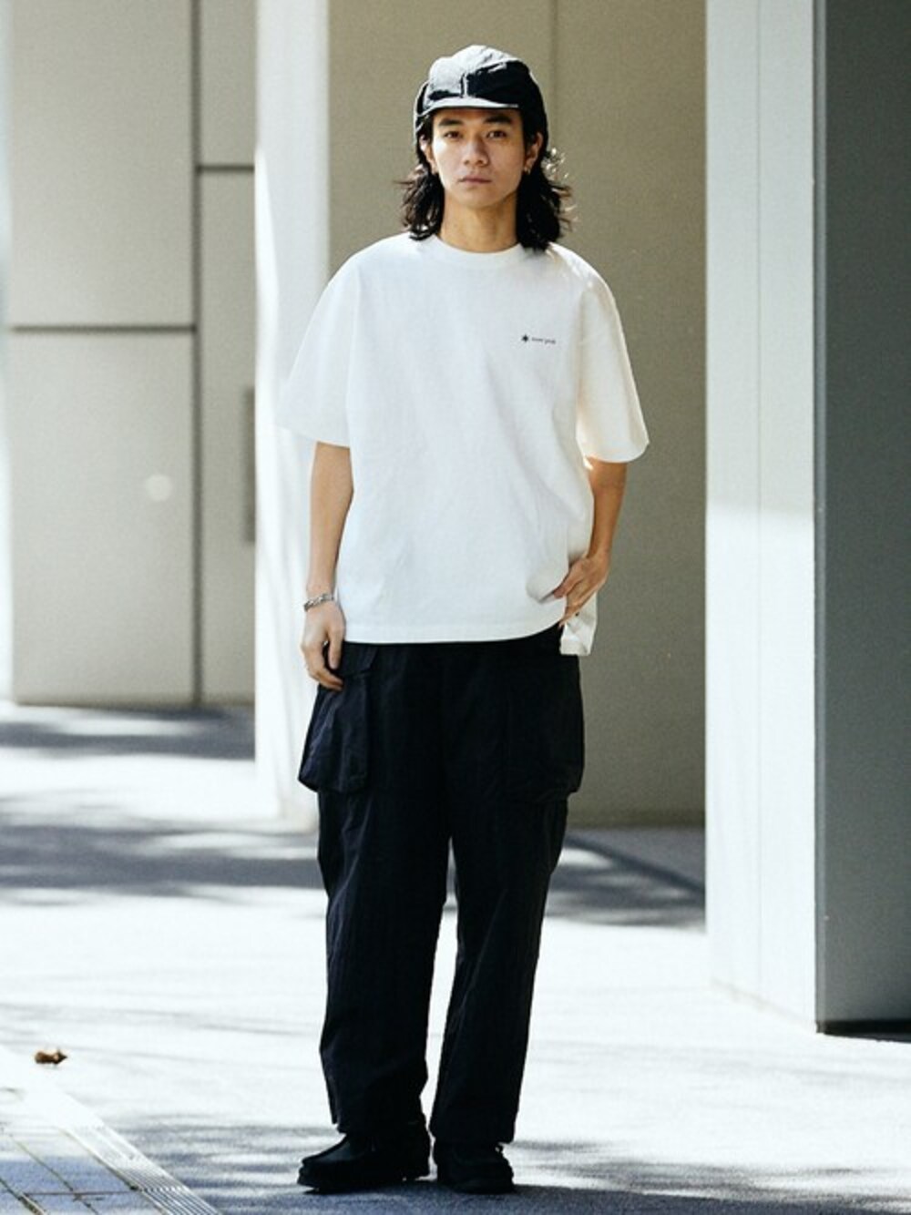 身長:181cm 体型:痩せ型 普段着用サイズ:L 毎シーズン大ヒットのSNOW PEAKプリントTシャツ。 人気のTシャツもジャーナルスタンダードらしく着こなすならカーゴパンツ合わせがおすすめです。 《Tシャツ》 着用サイズ:L 着用サイズ感:程よくゆとりがあり着用しやすかったです。 《カーゴパンツ》 着用サイズ:L 着用サイズ感:ゆったりと着用でき、サイズ感も丁度良かったです。