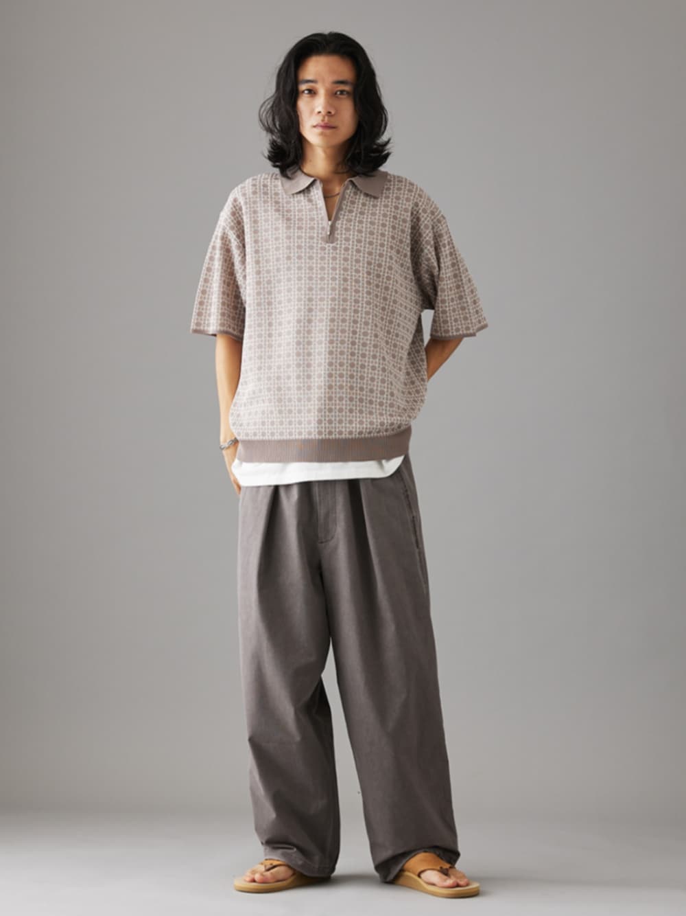 身長:181cm 体型:痩せ型 普段着用サイズ:L ハーフジップ型のジャカードニット。 グレーのワントーンで大人っぽく着こなしました。 シャリ感のある生地なので、夏でもさらっと着用できます。 《ハーフジップニット》 着用サイズ:M 着用サイズ感:程よくゆとりのあるシルエットで着用しやすいです。 《オーバーパンツ》 着用サイズ:M 着用サイズ感:ゆったりとしたシルエットで、裾を絞ることが出来る仕様。