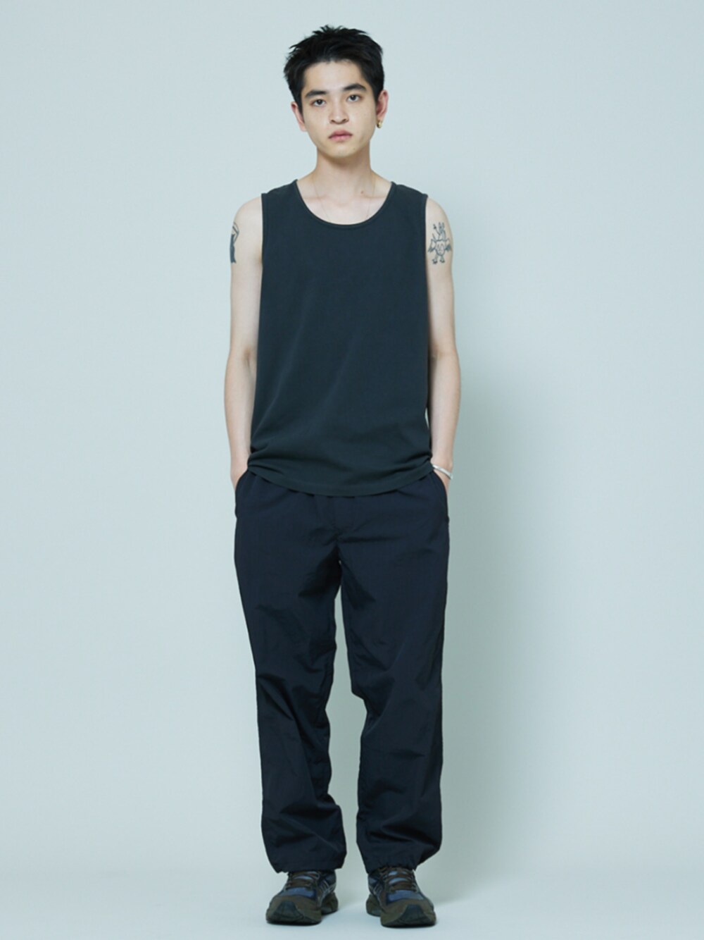 身長:180cm 体型:痩せ型 普段着用サイズ:L シェルテックにピグメント加工を施し、機能性とヴィンテージ感をだしたタンクトップ。 首元と脇の空き具合がちょうどいいので、暑い夏は一枚で着ることも可能。 《タンクトップ》 着用サイズ:L 着用サイズ感:ゆるっとしたサイズ感で、インナーとしても使える。