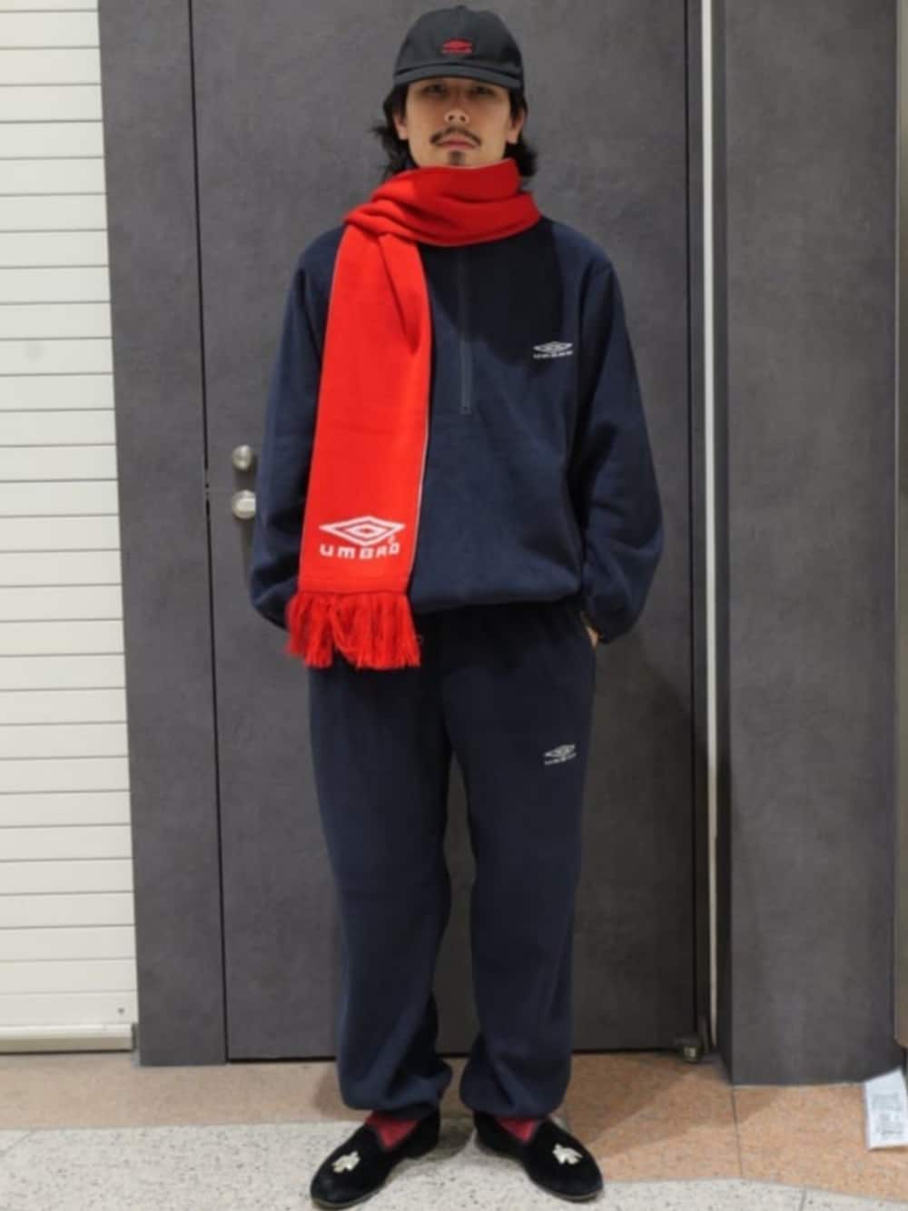 recommend styling 年齢:25 身長:173 体重:60 ・24011610012030 ◻︎UMBRO EX TEAM FLEECE RELAX HALFZIP TOP ¥22,000-(in tax) 秋冬シーズンにおけるフットボールシーン以外の移動や日常生活で着用するチームウェアから着想したフリース素材のセットアップ対応のトップス。レーヨンを混紡した特殊なポリエステル糸に起毛や特殊な柔軟工程を入れることで滑らかな風合いや膨らみ、自然で品のある光沢と毛玉になりにくい高ピリングの組織を組んだオリジナル素材。トップスは着脱の容易な深めのハーフジップディテールとサイドに剥ぎを取ったポケットが特徴。全体的にリラックスしたサイズバランスではありながら袖や裾のリブとゴムでアウトラインが膨らまないようコントロールして仕上げています。 ・24030610007030 ◻︎UMBRO EX TEAM FLEECE RELAX PANTS ¥17,600-(in tax) パンツはリラックスフィットでありながら裾のゴムで印象がだらしなくならないよう調節しながら、深めのサイドポケットやフロントサイドのキーループなどドローコード付きのイージーパンツにより実用性を付与しています。またトップス・パンツ共に通常内側に付くハンガーループをそれぞれ外側にセッティングすることでよりラフに日常動作や生活に溶け込めるよう配慮しています。 ・24098610000230 ◻︎ UMBRO EX STADIUM SIDE REVERSIBLE MUFFLER ¥11,000-(in tax) フットボールのファン象徴アイテムともいえるフットボールスカーフ(マフラー)を着想に、街で様々なスタイルにマッチする存在を目指し製作したリバーシブル仕様のマフラー。目の出方も自然体な糸の特性を活かしながら、それぞれのカラーでホワイトと上下糸にセットし編み上げたジャガード構造で配色仕様に仕上げています。軽さや肌触りはもちろん、太さや長さのバランスや寸法も、複数の巻き方に対応出来るバランスに調整を行っています。ジャガードの柄デザインも足し算の要素は極力控え、シンプルにイングランド旗とブランドロゴに留めることで様々なスタイルに溶け込めるよう意図的に総柄を避けています。