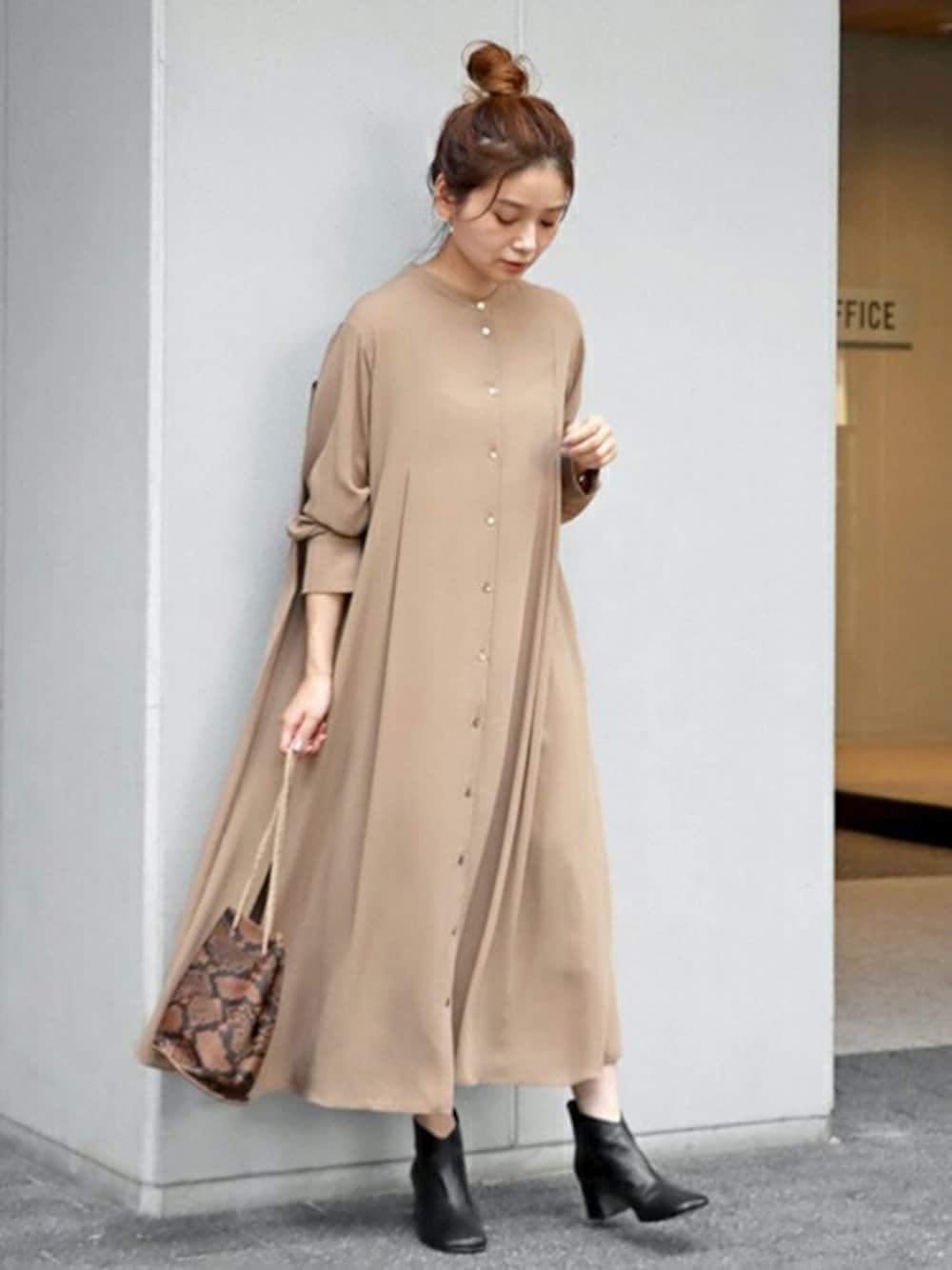 ■バックプリーツワンピース 1枚で主役になるワンピースが登場! 落ち感のある女性らしい素材で、背面に太幅のプリーツが施されたシャツワンピース。 動くたびにしなやかに揺れるバックプリーツが目を引くアイテムです。 ハイネックインナーやボトムを重ねてシーズン問わず着回しが楽しめ◎ ブーツ合わせできれいめにも、ボトムを重ねてカジュアルめにも合わせられます。 またご自宅でケアできるので一枚持っていると重宝します! サイズ感:全体的にゆとりのあるサイズ感です。 素材感:さらっとしている素材です。 着心地:体の線を拾わないシルエットで窮屈感がなく、ストレスフリーに着れます。