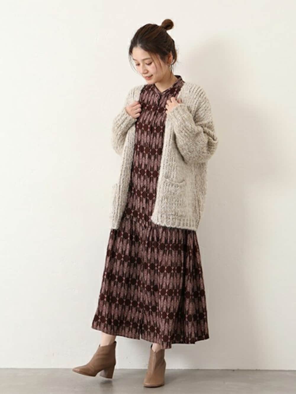 ■エスニックプリント バンドカラー2WAYワンピース 冬に映える柄ワンピース。 落ち感のある素材を選べば、レイヤードにもおすすめです。 ペチコート付きなので1枚着としても◎ 軽い羽織りとしても活用できるで、1枚で色々な着回しができるワンピースです。