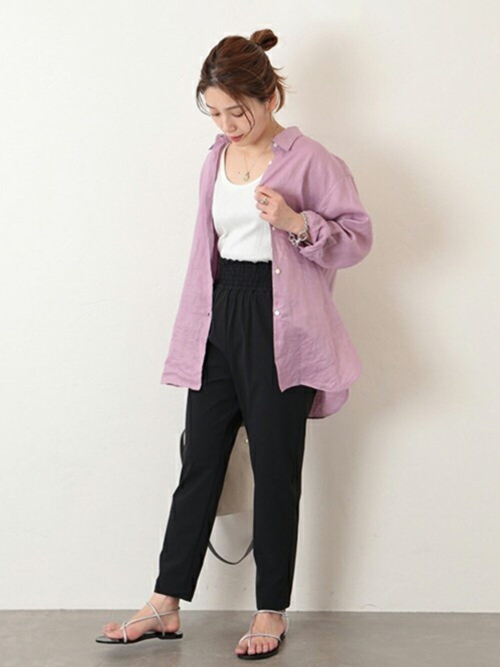 ■ナイロンストレッチパンツ 昨年大好評だった万能パンツが今年も登場。 暑い日にも快適に履いていただける薄手の生地で、これからの季節に重宝します。細身のきれいなシルエットにプラスし、機能面も充実。生地が縦横に伸びるストレッチ性、雨や水をはじきやすい撥水性、肌が生地に触れたときに冷たく感じる接触冷感性、洗濯によるしわがつきにくいイージーケア性をあわせもつ素材。ウエスト部分はゴムシャーリングで履き心地もラクチン。トップスを選ばず着まわしの効くシンプルなアイテムです。 サイズ感:すっきりしたシルエット。 素材感:ナイロン素材で軽い。ストレッチあり。 着心地:ウエストゴム仕様で、ストレッチが効いており履き心地がとてもいいです。いつもより、1つサイズ上げて履いてもすっきりしたシルエット感。ONOFFに使えます。
