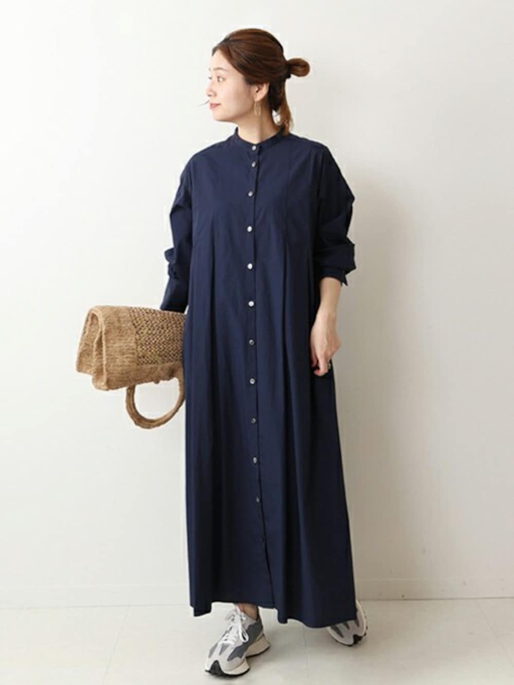 ■タイプライターバンドカラーロングワンピース バンドカラーのすっきりした襟元と、ストンと落ちたシルエット特徴のワンピース。 シンプルでクリーンなイメージで春にぴったりです。 フロントにさりげなく入った深めのタックや、1枚で完成する長めの丈感がポイント。 楽チンな着心地で、1枚でお洒落に見える優秀アイテムです。 サイズ感:程よいサイズ感。コンパクト過ぎないため、肩まわりも楽に着れます。 素材感:タイプライター素材。 着心地:丈がしっかりあるので、一枚でさらっと着たくなります。前開きなので羽織としても使えて便利です。