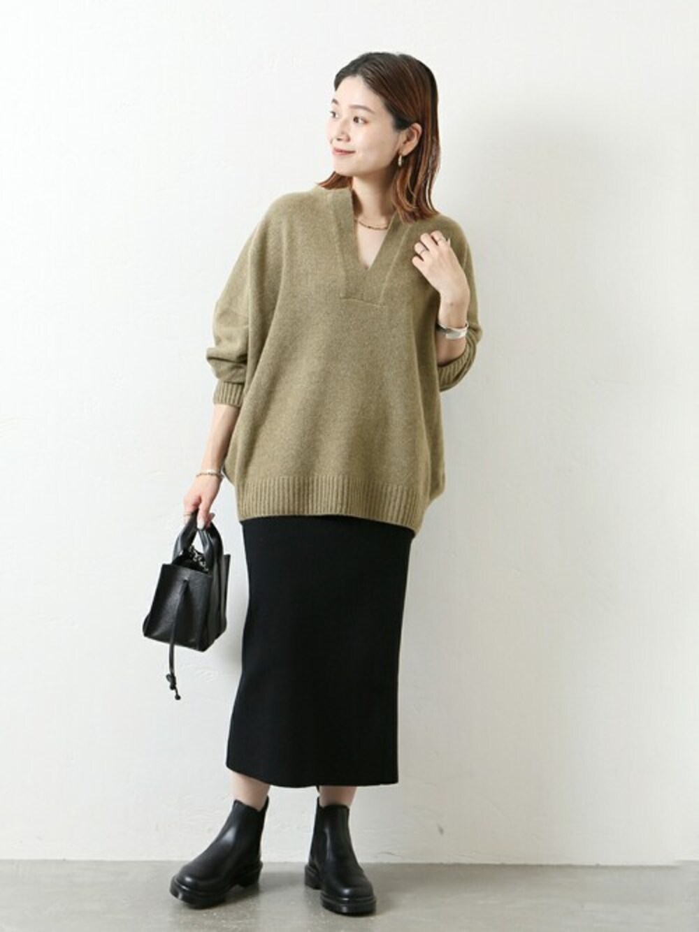 ■MUSIC カフタンプルオーバー 深めのスリットがポイントの女性らしいカフタンニット。 カシミア混でとてもあたたかくて柔らかい手触りの素材です。 ゆったりとしたサイズ感で身体をふんわりと包み込むようなシルエットも魅力です! 今回はタイトスカートを合わせて女性らしいスタイリングに。 ニット以外をブラックすることで統一して、大人なすっきりとした印象にしてみました。 サイズ感 :前後差がありヒップが隠れる着丈いです。ゆったりとしています。 素材感:とても肌触りの良い素材です。 着心地:シンプルで合わせやすいニットなので1枚あればヘビロテで活躍します。