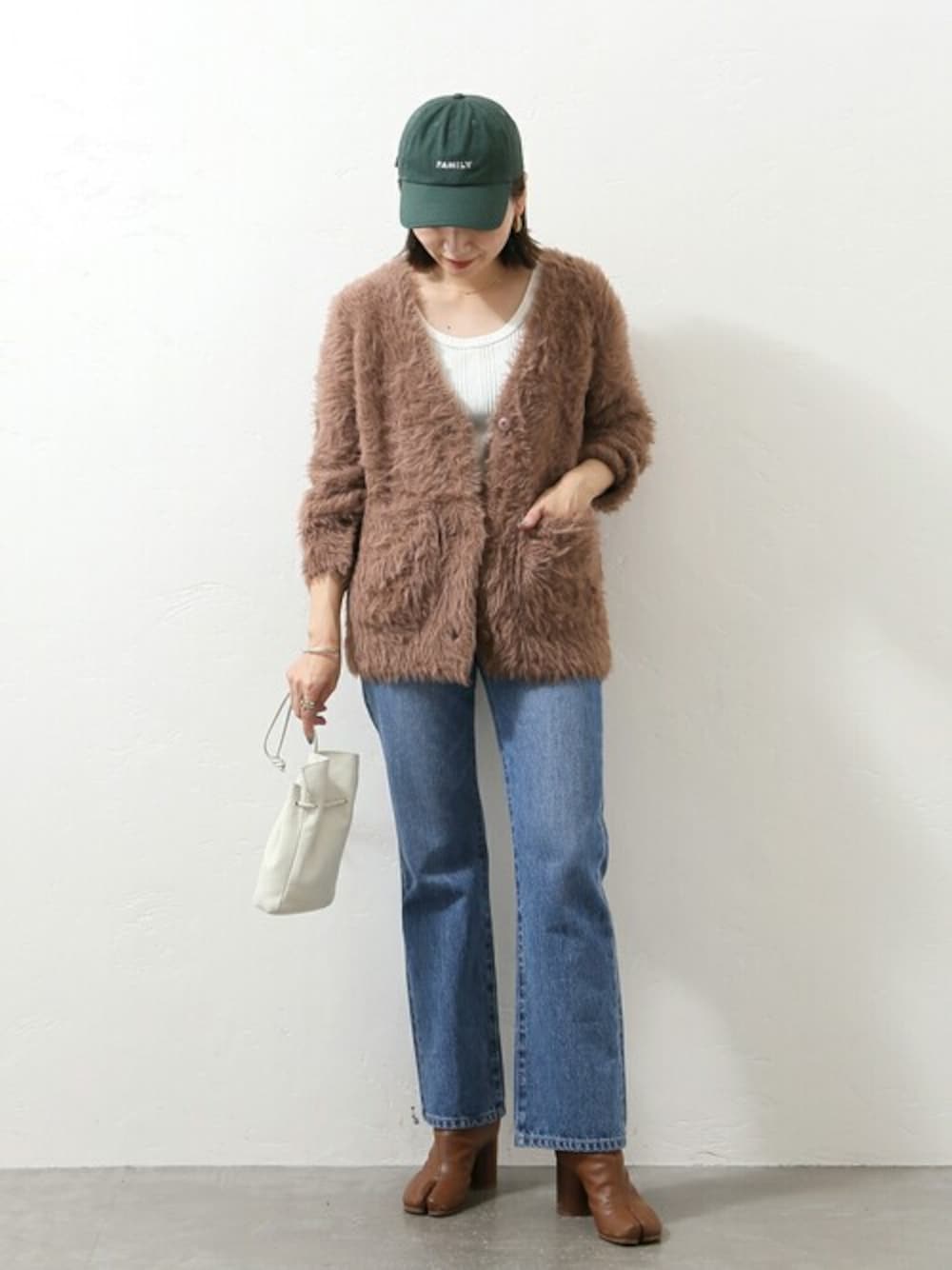 ■ファーヤーンカーディガン 毛足の長いファーヤーンを使用したVネックカーディガン。 カラーも可愛らしいカーディガンで、主役級のアイテムです。 私はカジュアルなスタイルが好きなのでデニム×キャップで合わせてみました! ●骨格/ストレート ●パーソナルカラー/イエベ春 ●普段サイズ/М サイズ感:程よくゆったりとしています。大きすぎません。 素材感:毛足がカールしていてふわふわとしています。 着心地:お尻が隠れるくらいなので、ワイドパンツやロングスカートでも◎ ※あくまでも個人の感想です。 Instagram➤onkanaa こちらもフォローしてみてください◎