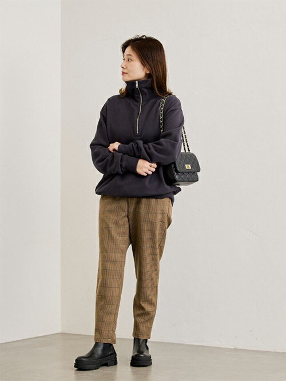 身長158cm/30代前半 普段サイズ:アウター38/トップスM/ボトム38/ワンピース38 パーソナルカラー:イエベ春 骨格:ストレート Instagram:onkanaa ----------------------------------------------------------------- 【商品名】ウールライクチェックパンツ 着用サイズ40 人気のウールライクパンツに秋らしいチェック柄がお目見え。 ストレッチが効いていて穿きやすいパンツです。 テーパード型でスッキリ着用できるので、お仕事用としても◎ トレンドのジップスウェットでスタイリング。 テーパード型にサイドゴアを合わせるのもおすすめです。 ----------------------------------------------------------------- 【サイズ感】 ウエストはゴム仕様です。40着用しましたが、サイズ選びは普段サイズで問題ないかと思います。 40だとやや太もも周りなどに緩さが出ました。 【素材感】 温かみのある素材感です。 ストレッチが効いています。 ※あくまでも個人の感想です。