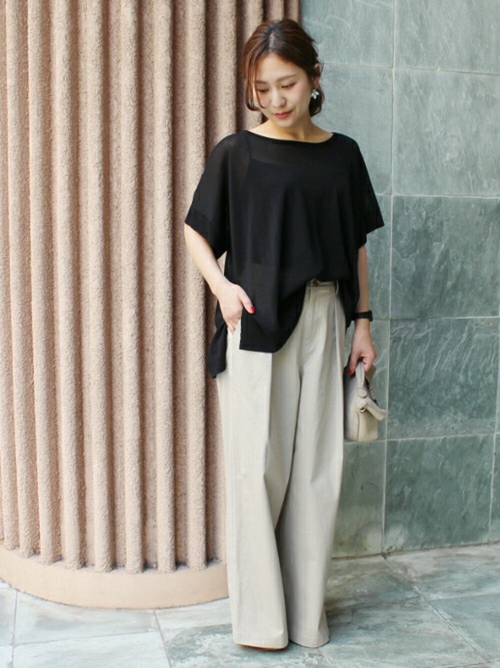 フロントのタックがポイントのワイドパンツが登場。 程よい透け感のある春ニットと合わせて大人っぽく◎