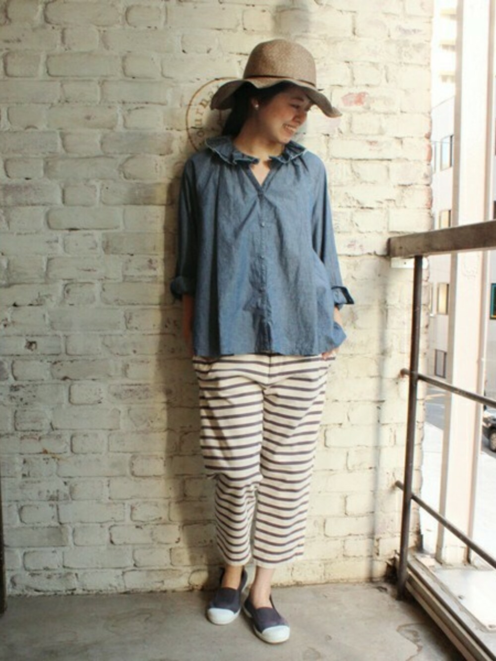 襟元のフリルが可愛らしいブラウスに、カジュアルなボーダーアイテムを合わせてカジュアルに仕上げました。 袖はロールアップしてすっきりと合わせて。