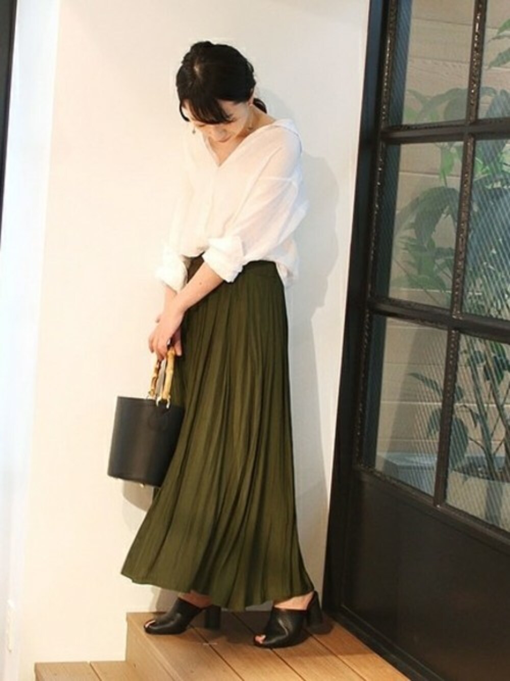 ◆新鮮見え!スカートスタイリング! 定番アイテムも秋色で新鮮見え! 今からでも涼しく着れるスカートは今から取り入れたいアイテム。 レザーの小物を合わせてシックに。