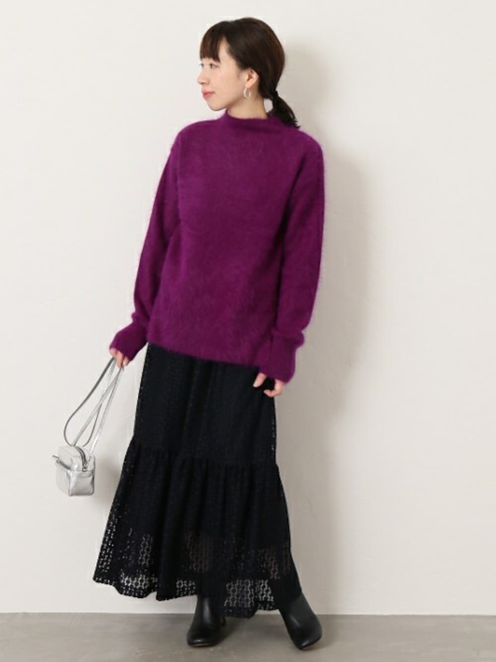 アンゴラ混で、ミンク加工によりファーのような毛足の長いニット。パープルのカラーが大人上品な印象に◎