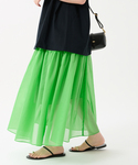 ◆シアーローンティアードスカート シアーな素材と華やかなカラーが印象的なスカート。 大人の女性が着やすいよう、ギャザーの分量を調整し、 ティアードデザインながらボリュームが出すぎないようなシルエットに。 サンダルはもちろん秋にかけてはブーツでもあわせやすい着丈です。 ブラウスできれいめに、Tシャツでカジュアルな合わせもおすすめです◎ ********************** 透け感:あり 裏地:あり 伸縮性:なし 光沢感:なし 生地の厚さ:薄め