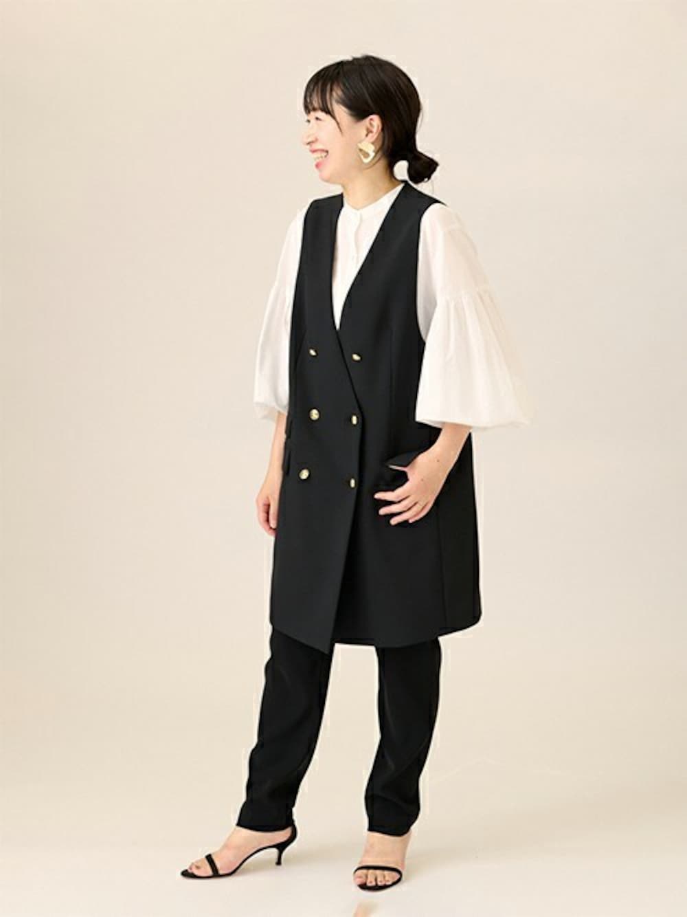 ◆ヴィスポリノーカラーベスト L'ESSAGEで人気のロングベストが登場! 大人な印象のノーカラーベスト。 すっきりとしたシルエットで、パンツはもちろん、ロングスカートと合わせたスタイリングにも◎ 肌寒い時期はニットで、暖かくなってきたらカットソーやブラウスなど、 インナー次第で長く着ていただけるアイテムです。 ボタンを全部閉めて、ミニワンピース風な着こなしも◎ ********************** 透け感:なし 裏地:あり 伸縮性:なし 光沢感:なし 生地の厚さ:普通 **********************