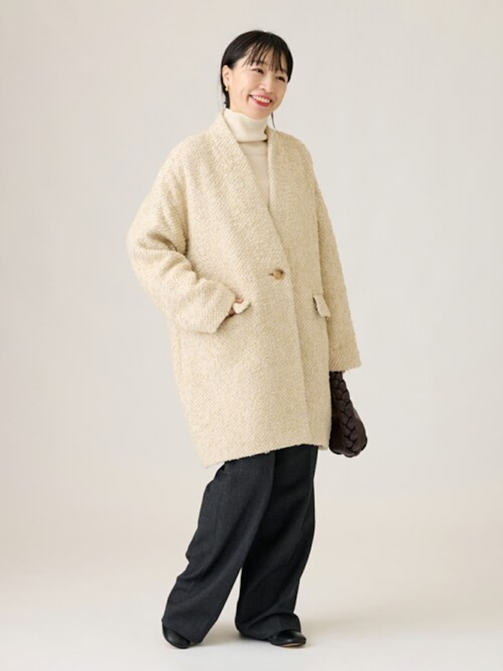 JOURNAL STANDARD 本社スタッフBのノーカラーコート「コクーンミドルコート2」を使ったコーディネート