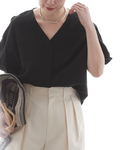 ◆ヴィスリネンVネックブラウス 1枚で着映えするシンプルなVネックブラウス。 前開きにもなりシャツ感覚でも着用でき、ボタンは見えない仕様ですっきりした印象になっています。 リネン混のしなやかさのある上品な素材感。 休日のお出かけシーンはもちろんお仕事用にも◎ 同シリーズのイージーパンツとセットアップもおすすめです。 ご自宅で洗えるのも嬉しいポイント。