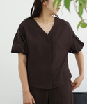 ◆ヴィスリネンVネックブラウス 1枚で着映えするシンプルなVネックブラウス。 前開きにもなりシャツ感覚でも着用でき、ボタンは見えない仕様ですっきりした印象になっています。 リネン混のしなやかさのある上品な素材感。 休日のお出かけシーンはもちろんお仕事用にも◎ 同シリーズのイージーパンツとセットアップもおすすめです。 ご自宅で洗えるのも嬉しいポイント。